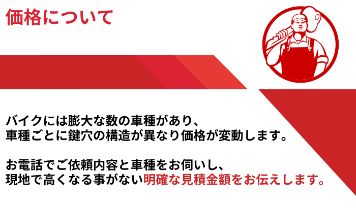 | 鍵折れ抜き作業 | 5,000円〜 ※他の作業と同時に行う場合は+3,000円となります。 ※そのバイク以外の鍵や異物混入の場合は対応不可 |