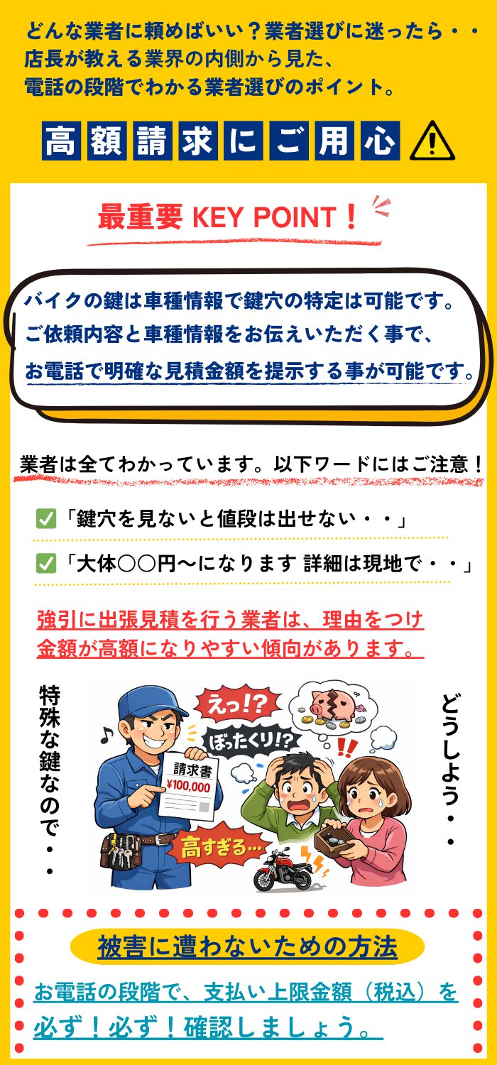 ※価格はメーカー・車種により変動いたしますので詳しくはお電話にてお問い合わせくださいませ。 ※表示価格には出張料は含まれておりません。現場の市区町村により別途出張料が必要になります。詳しくはお電話にてお問い合わせくださいませ。 【よくあるトラブルケース】例)メットインにインロックの可能性がある場合、まずメットインを開けて中に無い場合は作成に変更もできます。 この場合は作成料金のみで対応可能です。 |